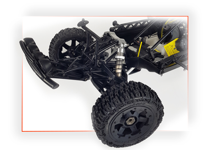 طبقهای جلو و عقب این ماشین از جنس پلاستیک فشرده و منعطف ساخته شده است تا در ضربات استقامت بالایی داشته باشند. کمک فنرهایی با بدنه تماماً آلومینیوم و سیستم عملکرد روغنی با قابلیت تنظیم ارتفاع , هندلینگ و کارایی بسیار خوبی در سرعتهای بالا و سر پیچها فراهم کرده است. این کمکفنرها بر روی یک نگهدارنده (Shock-Tower) آلومینیوم با آلیاژ 6061 که وزن کم و استحکام بسیار بالایی دارند نصب شدهاند . همچنین شفت کمکفنرها نیز توسط گردگیرهای لاستیکی بخوبی در برابر خاک و آلودگی که عامل اصلی ساییدگی و فرسودگی اُرینگهای کمکفنر هستند , محافظت میشوند .